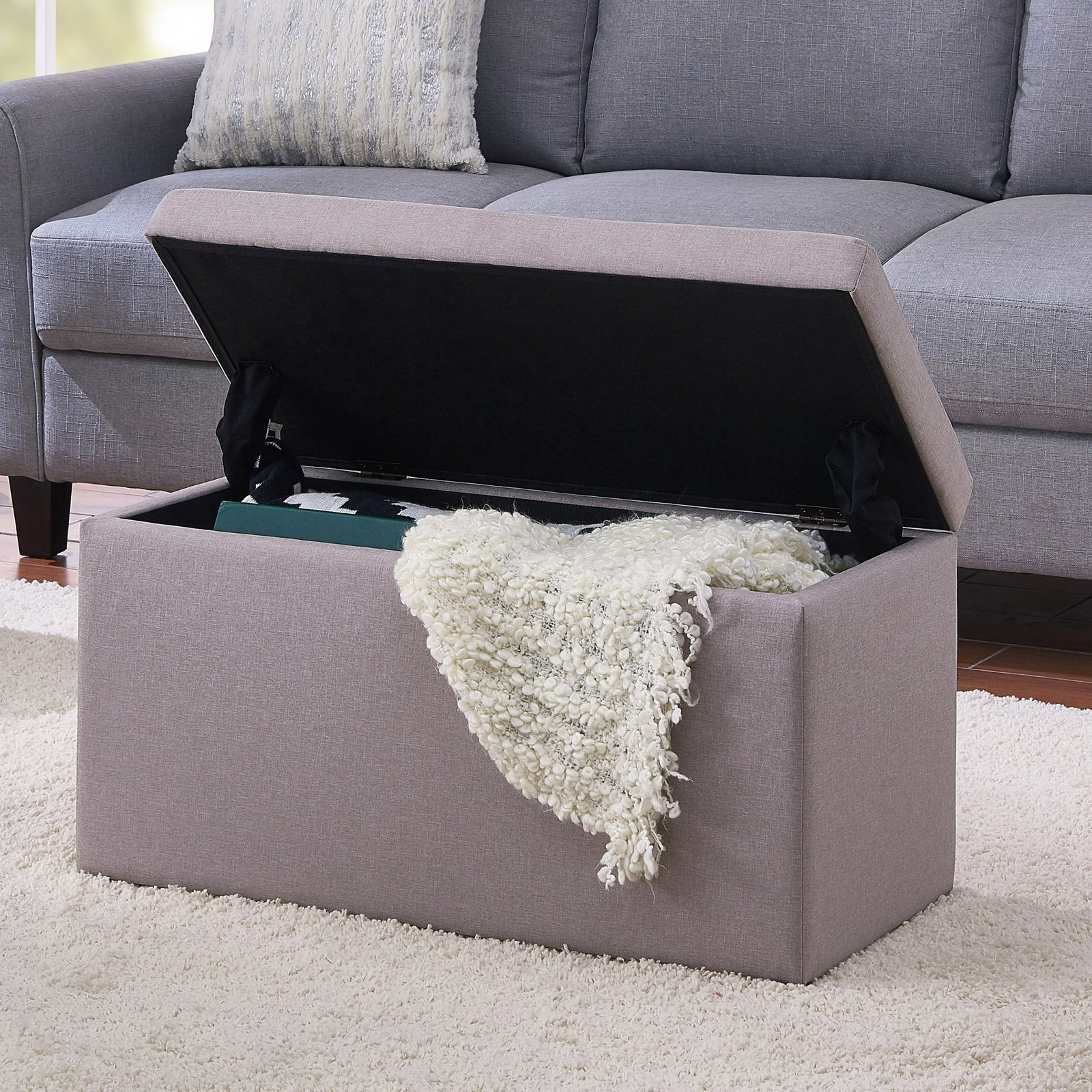 HOMCOM Ottoman Bench with Storage, Fabric Footrest Shoe ... from i5.walmartimages.com The hinge should come with screws. Place the back plywood on a flat surface, put the pocket holes faced down. Mark the locations for the compartment dividers. If you want to have the lid open in multiple sections, cut the hinge piece that will attach to the top boards. The width of 1×3's can vary, so you may want to put the top and bottom long trim pieces on the bench, flush with the top and bottom respectively. Time for assembly, i like to use the impact driver for driving the pocket hole screws. The backpack storage bench was stained with varathane briarsmoke. After the stain dried, a coat of two of satin polyurethane.